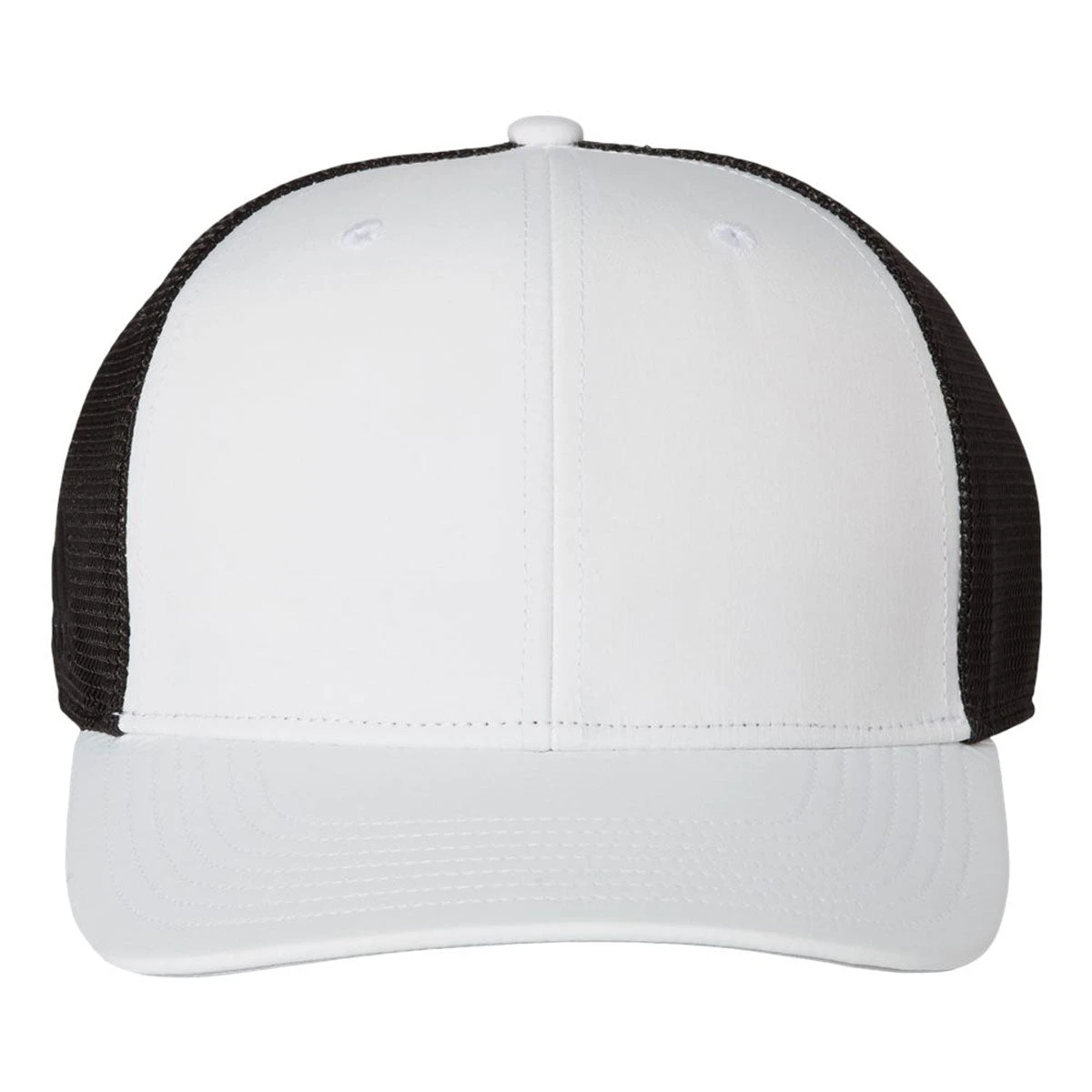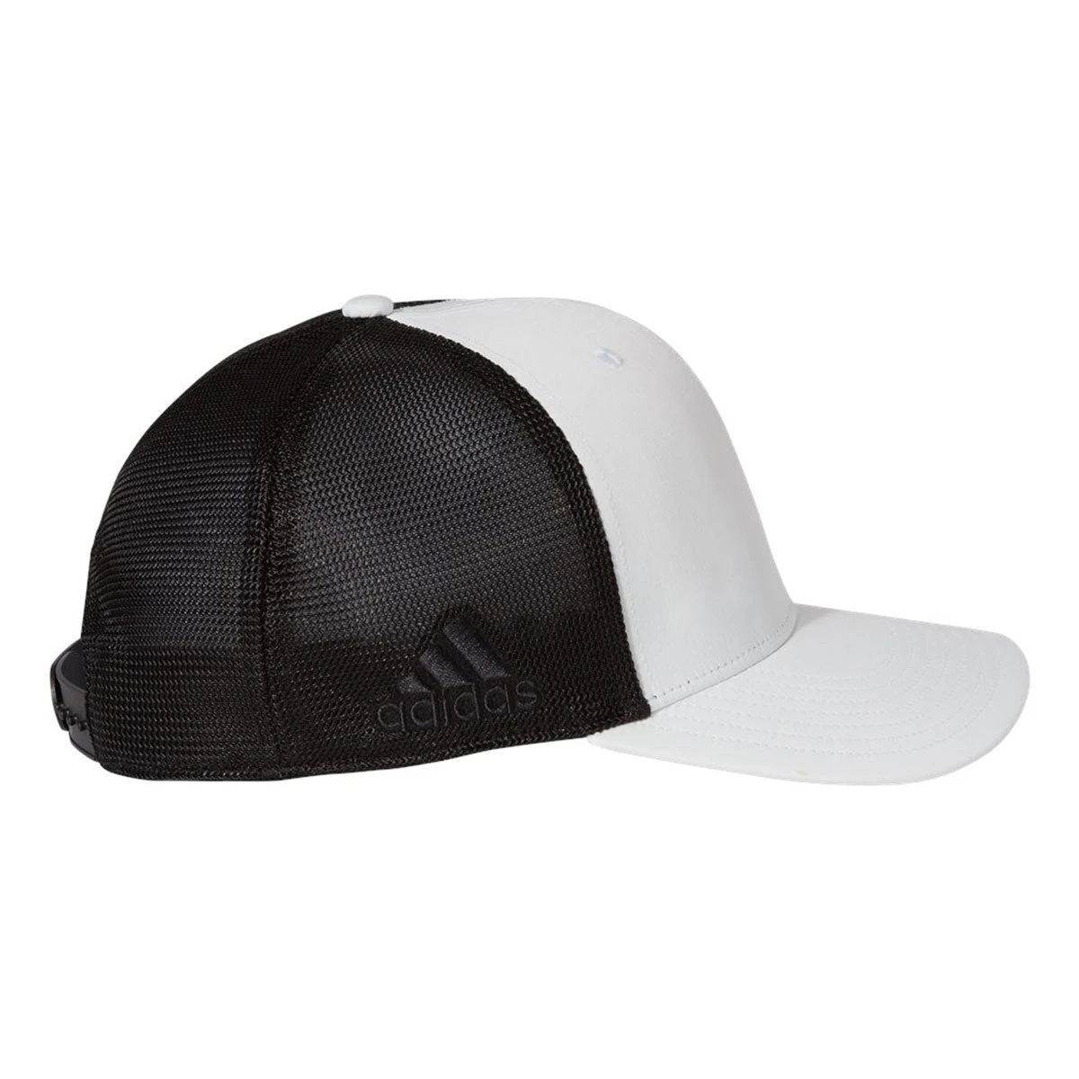 Choose your embroidery for the adidas White/Black Poly Trucker Cap with two-toned options that will make your custom logo pop. The simple polyester spandex blend with snapback closure makes this cap adjustable for most sizes. The mesh polyester back, traditional for trucker style caps has an Adidas logo on the side for added flair. Add your company logo to offer these as employee gifts for any occasion or a custom logo to give out as part of an organizational uniform or promotional item. The slightly curved brim and self-fabric sweatband will keep you cool and protected as you enjoy your day at work or play.