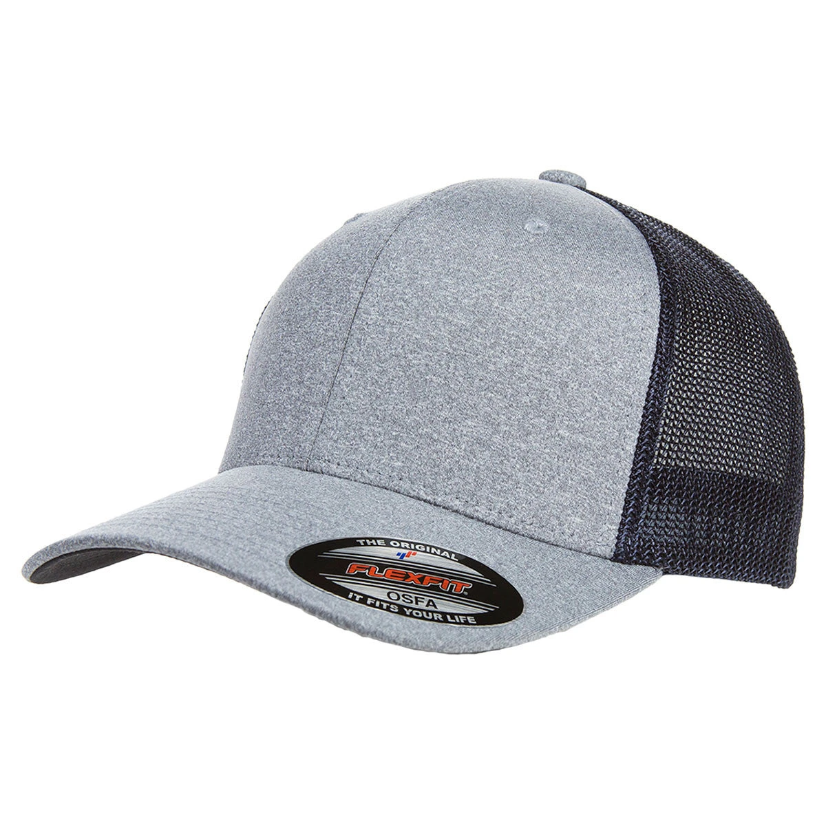 For those who prefer to have their embroidered logo on a cap that has breathable, stretch mesh back the Flexfit Heather/Navy Adult Poly Melange Stretch Mesh Cap. Since one size fits most individuals it is an ideal give-away for any company celebration or event. It has six panels and is considered mid-profile. You can see the eight row stitching on the bill and the hard buckram backed front panels. The mesh on the side and back is polyester with spandex which allows the appropriate give. The original Flexfit sweatband retains its shape and all color combinations have a black underbill. Choose from heather grey with black mesh, heather grey with navy, heather grey with red, heather grey with royal blue and heather grey with white.