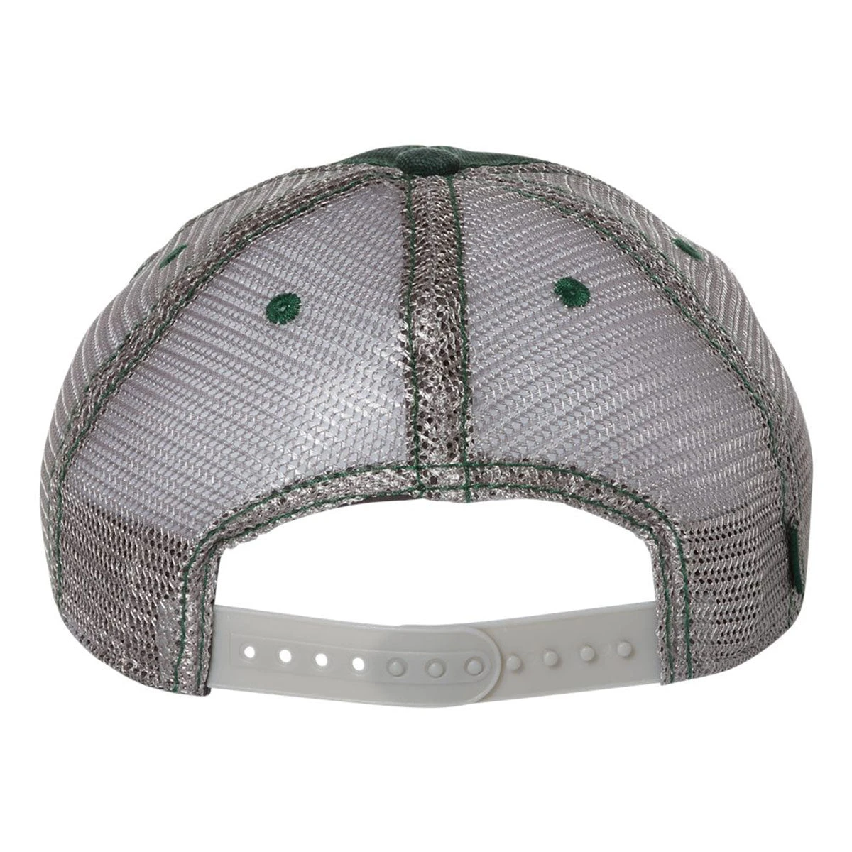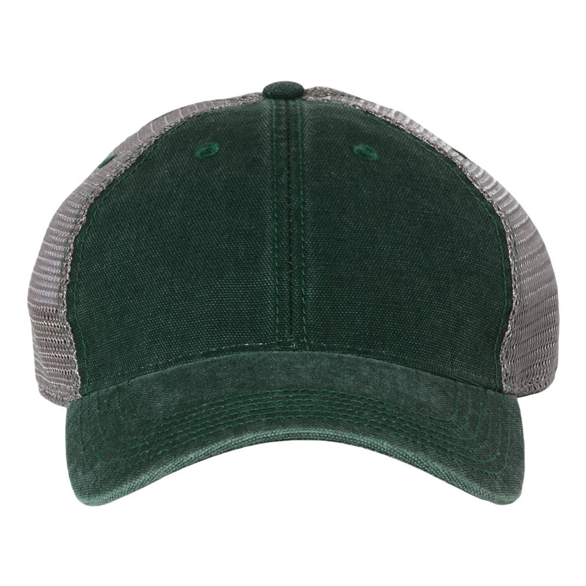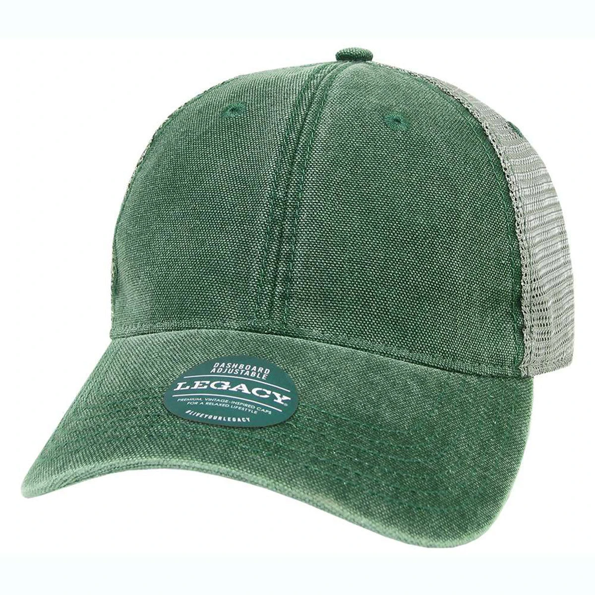 Go old school with embroidery on a Legacy Dark Green/Grey Dashboard Trucker Cap. In true trucker cap style fashion, the cotton polyester front is completed by the washed canvas crown and mesh back. The worn in look adds flair to this traditional style with the pre-curved visor for impressive fit. Add a company logo to use as part of employee apparel or uniform wear or add a custom logo to create a unique gift or sales item. The unstructured, six-panel, low profile design is comfortable from day one in the one size fits most style with snapback closure for adjustment.