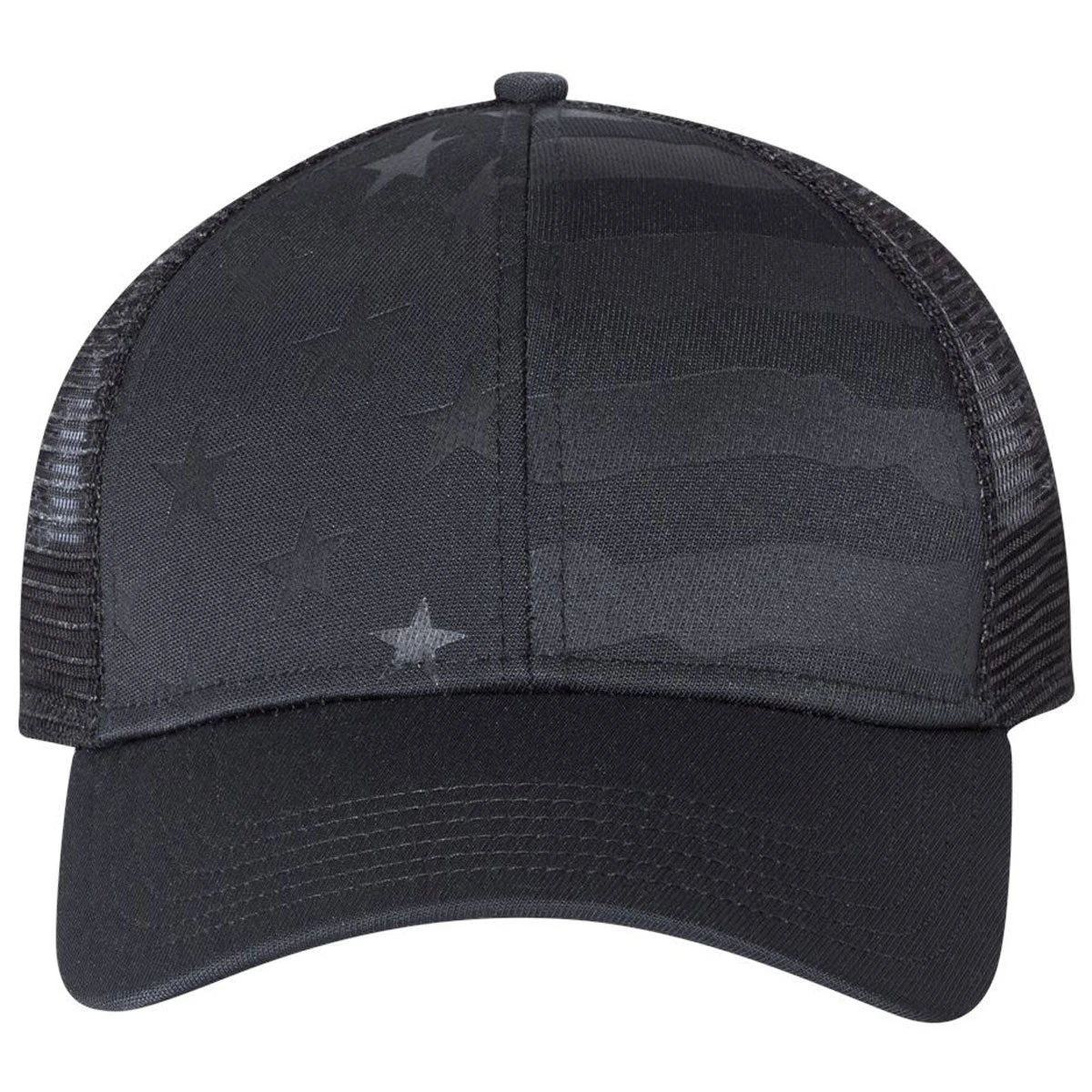 Promote your love of country and your company at the same time by wearing the corporate logoed Outdoor Cap Black Debossed Stars and Stripes with Mesh Back. The nylon mesh back encourages the circulation of air to keep your comfortably dry and cool when the pressure ramps up during a big company golf outing. Six structured panels and a mid-profile look give you plenty of visual room to track down a fly ball or discover the cause of a leaky roof. Use the strategically placed embroidery area to add your company logo. With logoed corporate apparel, you make your presence well known in the community.