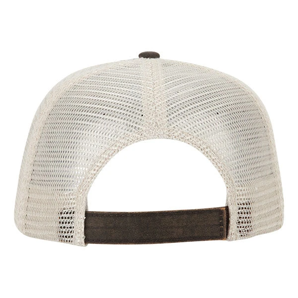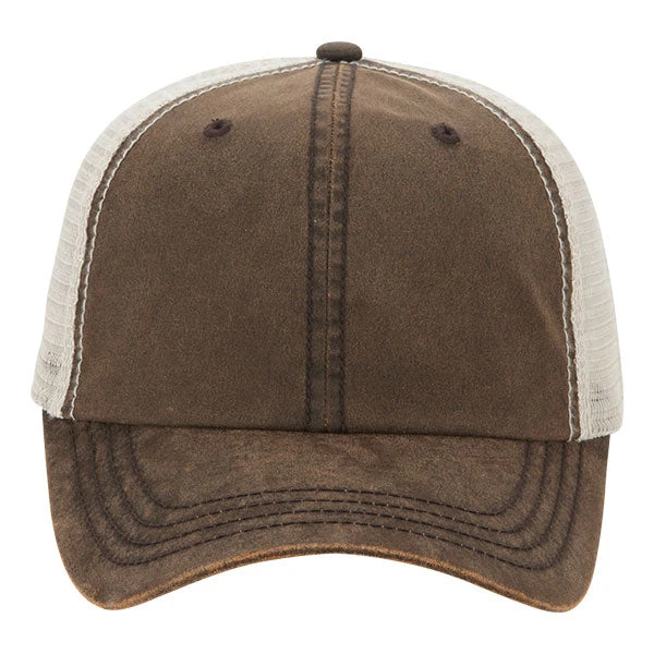 The Paramount Apparel Brown/Ivory Wax Cloth Mesh Cap uses a wax cloth body that features a heavy stone wash surface. The Velcro enclosure promises a comfortable fit. The light tone produced by the fade on this outfit produces an aged look reflective of one’s experience and hard work. The intriguing mesh surface on the back adds to the color combination while allowing air to move through with ease. You can add any custom logo to the front as well. This would make a nice addition to your company uniform if your business focuses on heavy duty outdoor activities among other things.