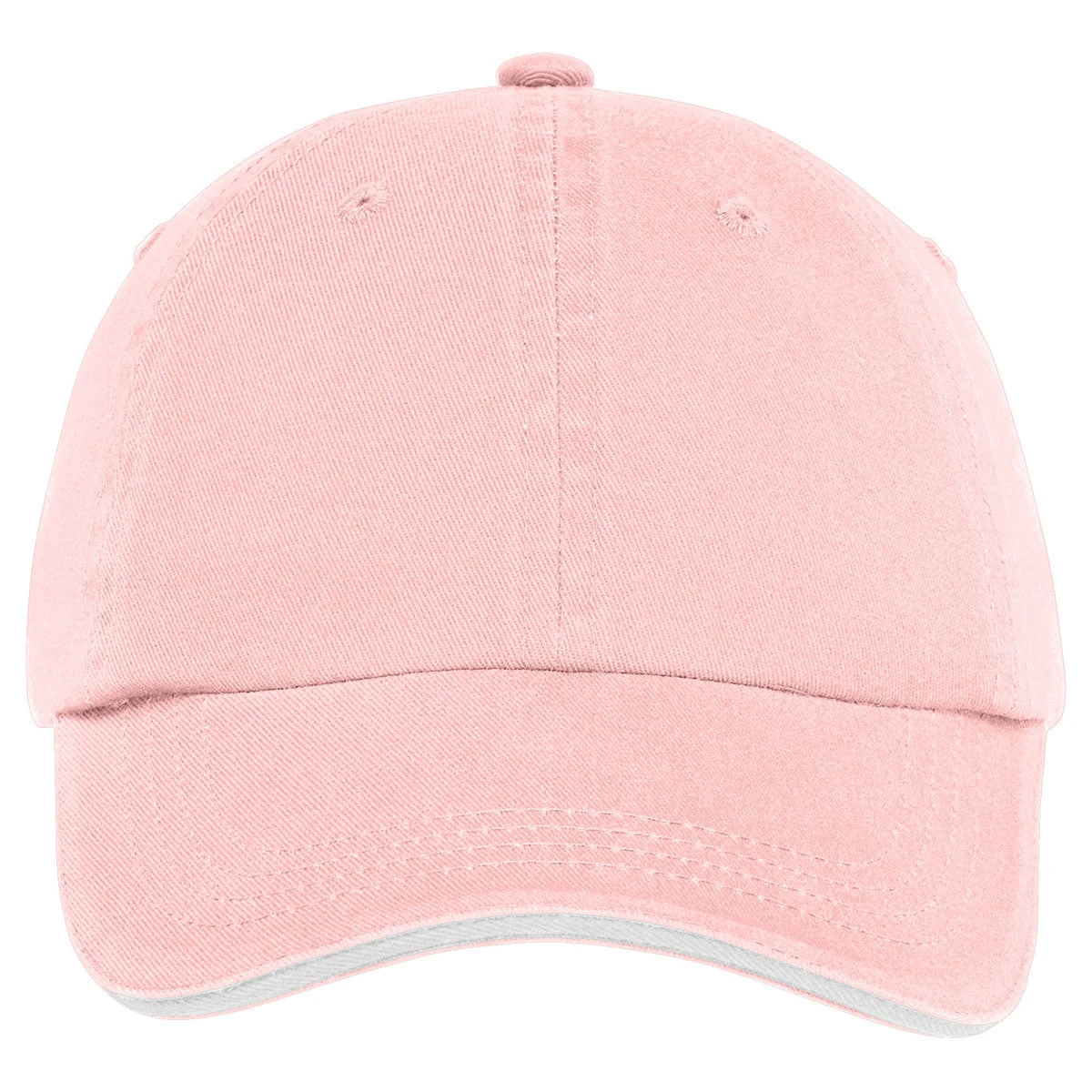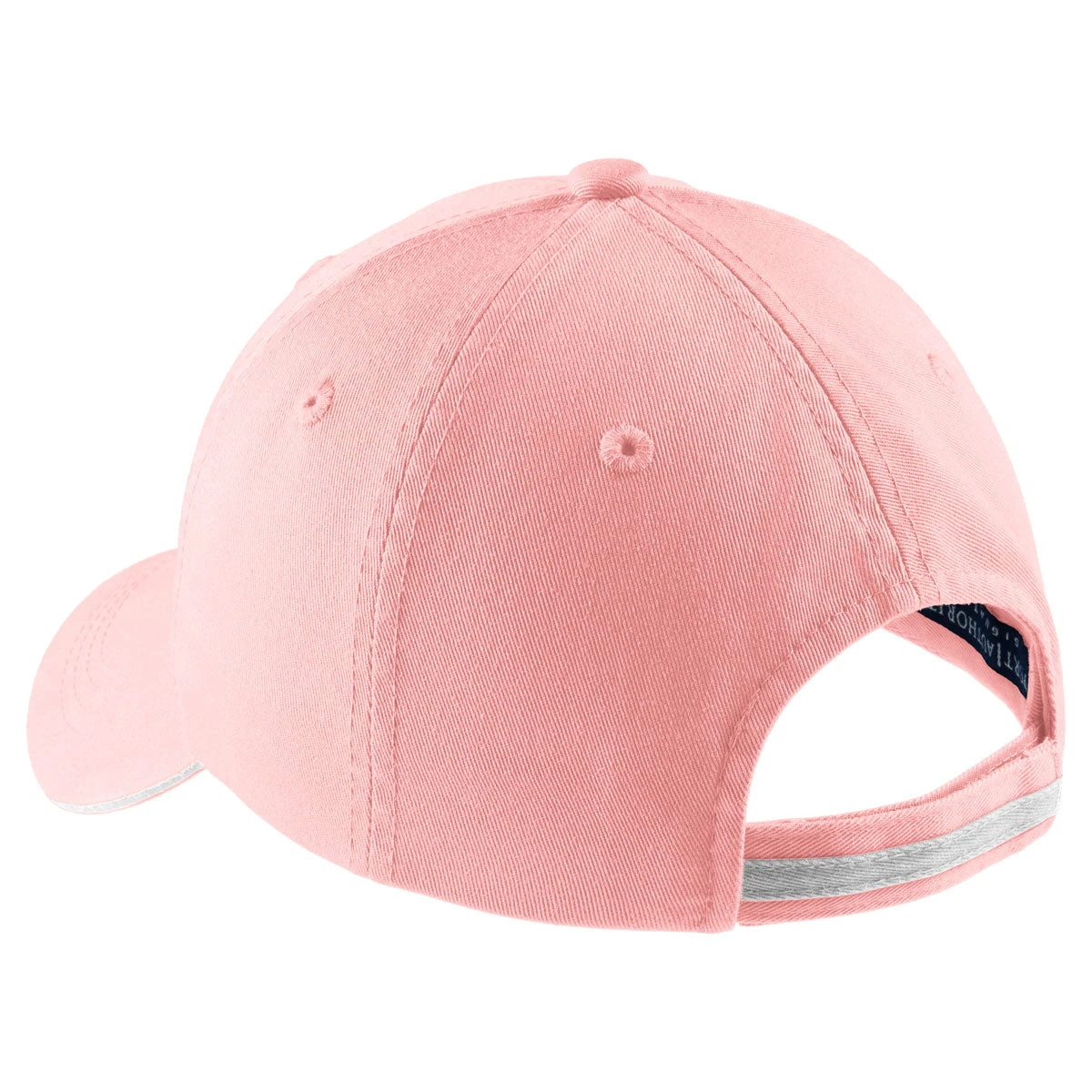 What makes a hat great? Well, it depends on the use. Create some great branded apparel out of this Port Authority Light Pink/White Sandwich Bill Cap with Striped Closure with our custom embroidery process and use this headwear for gifts, employee uniforms, giveaways, and much, much more. If only every piece of active wear could be this versatile.