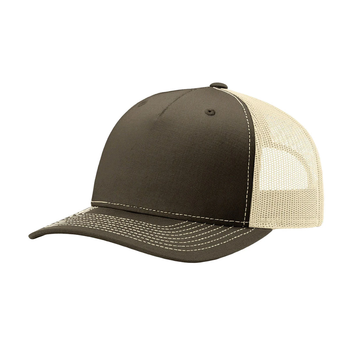 For repeated and visible advertising, marketing or sponsorship opportunity for company sports events, the Richardson Chocolate Chip/Birch Mesh Back Five Panel Trucker Hat is set to sport your corporate logo or team name. This cap’s mesh back construction ensures optimal breathability, while the pre-curved visor keeps the sun away from eyes. Express your brand swag or team spirit with this customizable trucker cap from Richardson.