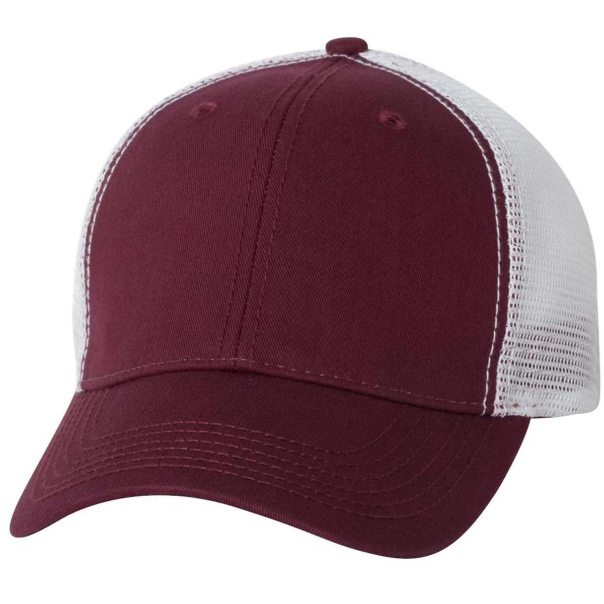 Create a custom classic with the Sportsman Maroon/White The Duke Washed Trucker Cap in a large variety of color combinations. Made of cotton and a polyester bio-washed chino twill front with 100% polyester mesh back, this trucker cap will be an instant favorite for most. The structured, six-panel, mid-profile fit has a pre-curved visor and sewn eyelets for the true trucker cap look. Add a custom embroidery to have custom headwear people will want or a company logo to use this as part of employee apparel. The hook and loop closure means adjusting the size of this cap is a breeze.